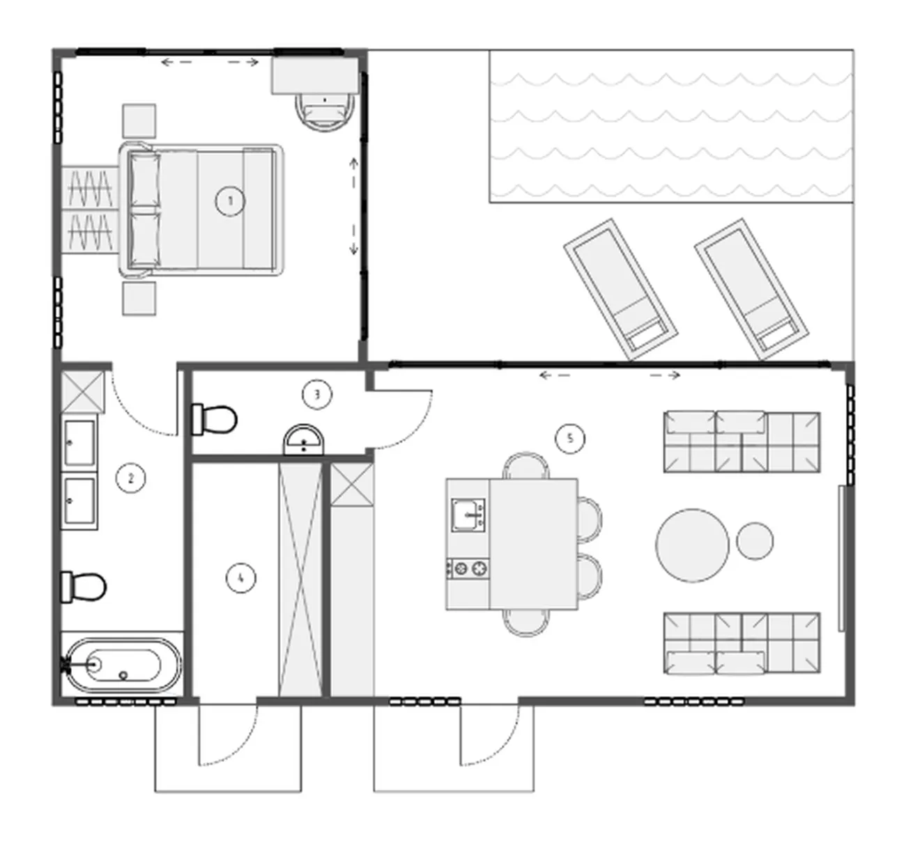 The villa features a generous master bedroom (17.22 m²) with its own en‑suite bathroom (7.65 m²), plus an additional guest powder room (2.69 m²) for convenience. The true highlight is the expansive open‑plan kitchen and living area (37.45 m²), which flows seamlessly onto a private swimming pool and sun terrace. Large glass doors invite natural light and tropical breezes, blurring the line between indoors and outdoors. With dedicated spaces that feel both intimate and open, this layout is ideal for those who value privacy without sacrificing a sense of space.