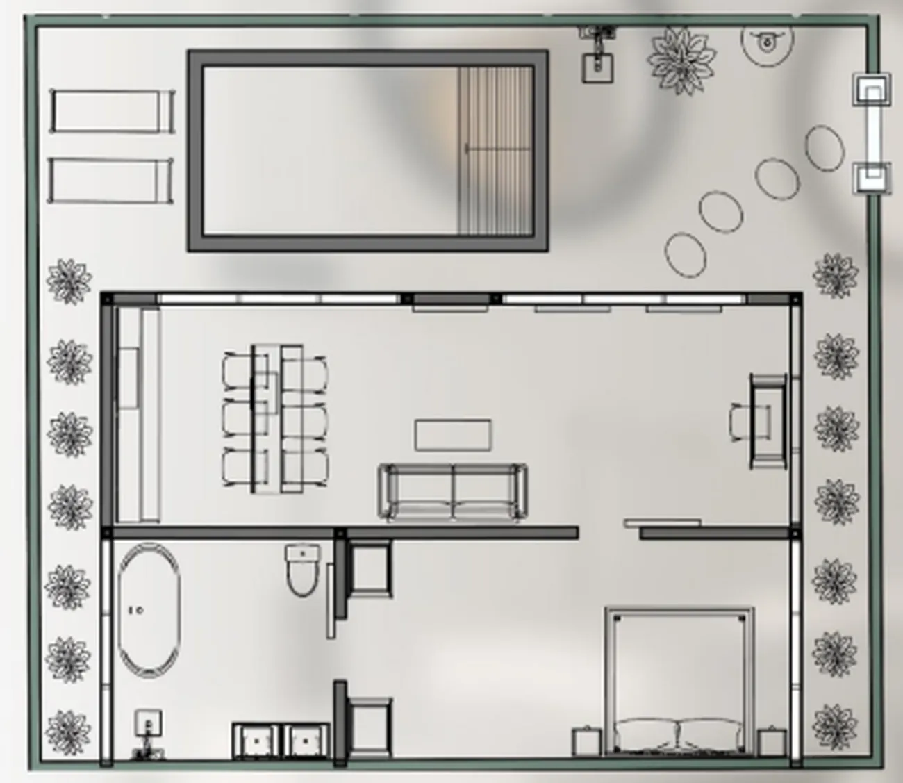 Вилла предлагает просторная спальня (18 м²), a просторная ванная комната (9 м²), и открытая планировка гостиная и кухня (27 м²), спроектированный для легкого перемещения из помещения на улицу. Большие стеклянные двери соединяют жилую зону непосредственно с террасой у бассейна, создавая плавный переход между отдыхом и релаксацией. Планировка обеспечивает максимальный комфорт и уединение, а также продуманное разделение спальной и общественной зон. Частный бассейн - идеального размера, чтобы охладиться или понежиться - добавляет в повседневную жизнь нотку курортного отдыха.